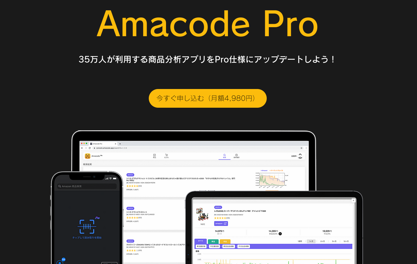 製品のバーコードを読み取り、Amazonの価格を瞬時に調べる転売支援ツールである無料アプリ『Amacode』の上位版。